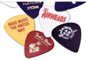 Professional quality customized guitar picks. Great for tradeshow giveaways, wedding favors or crowd tossing. Made in the USA. Custom imprint area is 3/4" in diameter. Less than $ .40 each in the minimum of 1000.