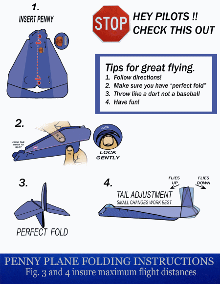 Paper planes are available in stock designs for your custom imprint or they can be completely custom printed. Each plane measures 8 1/4" long X 3 3/4" wing X 3 1/2" tall. The Penny planes are printed on #100 gloss cover stock that is easy to fold. All fold lines are not only pre-creased but are also color coded for supereasy folding. Just add a penny for a weight and your plane with your custom message is ready to fly! The stock planes have at least 8 different locations for your custom message or logo. Minimim order is 250.