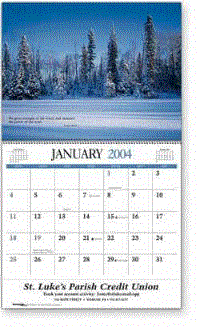 This 10 7/8" X 16 3/4" (open) calendar features both Old and New Testament Bible verses with beautiful nature shot of the various seasons for that particular month. Minimum quantity is 100.