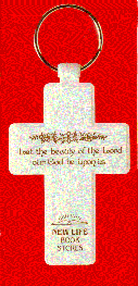 This Cruxifix key chain is available in white with a gold imprint. The size is 3" X 2" with a minimum quantity of 250.