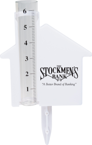 The House Rain Gauge measures 6 3/4" wide X 10 3/4" high with an imprint area of 2 1/2" wide X 3 1/2" high. Minimum imprintable quantity is 250.