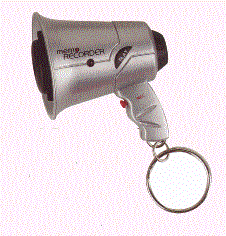 The Megaphone shape voice recorder measures 2" long X 2 1/4" X 1 1/2" diameter and provides an imprintable area of 3/4" wide X 1/2" high. It has a ten second single message recorder and the battery is included. Minimum imprintable quantity is 50.