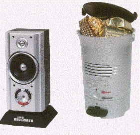 On the left the Speaker shape voice recorder measures 2 1/2" wide X 2 3/8" X 4 1/2" high and provides an imprintable area of 1 1/2" wide X 1/2" high. It has a twenty second multi-message recorder. The right picture is the Multipurpose Storage Bin Voive Recorder that also has a twenty second multi-message recorder. It measures 3 1/4" X 3 1/2" X 4 3/4" high and the imprintable area is 1 1/2" wide X 1/2" high. Both of these recorders take four "AAA" batteries which are NOT included with the recorder. Minimum imprintable quantity is 50.
