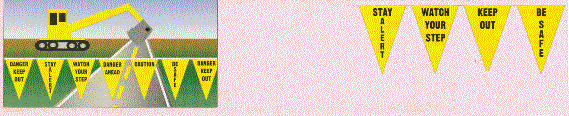 Here are just a few of the safety slogan flags that we can provide for you. Pictured below are various pennants that are 12" X 18" and come in a 60 ft. string. The material is yellow with black copy and are made of 4 ga. virgin polyethylene plastic.