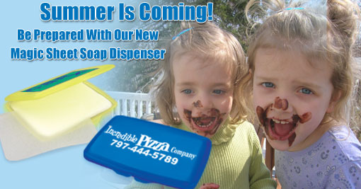 The easy to carry dispenswe case includes 20 sheets of paper thin, fragrant anti-bacterial soap. To use simply remove one sheet and add water. The case is available in either White or Translucent Blue or Translucent Yellow. The case measures 2 3/16" X 3" X 3/16". The custom imprint area on the case is 2" X 1 1/4". The minimum order is 250.