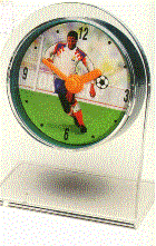 The Analogue Soccer Clock has a rotating soccer ball . The size is 4" long by 2 1/4" wide by 5 1/4" and provides you with an imprint area of 3 1/2" long by 1 1/4" wide. We also have this clock available in baseball, tennis, golf, football, golf, basketball and hockey. Minimum imprintable quantity is 50.