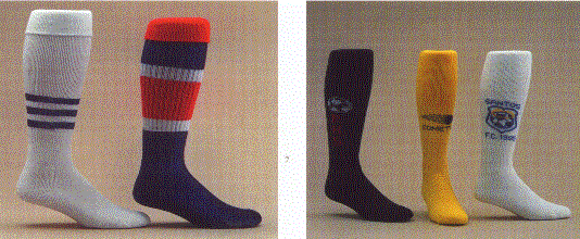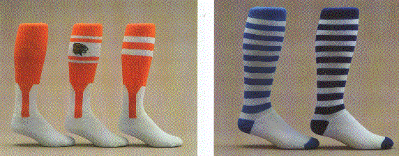 The left picture has pictures of custom color combination stripes that can be madto your individual requirements. They are 80%acrylic and 20% nylon. The picture on the right shows amples of custom soccer socks.