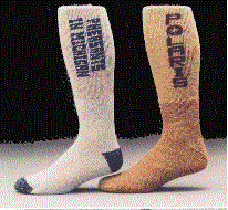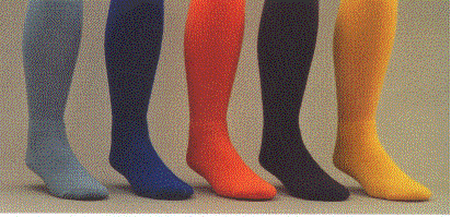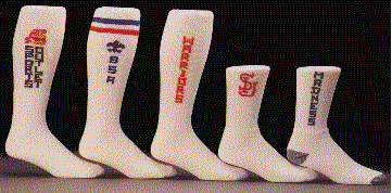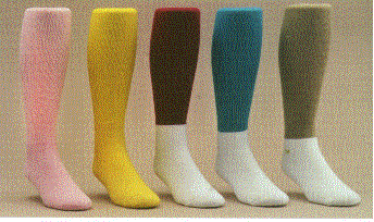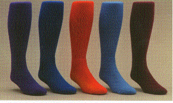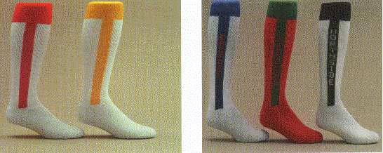 The first two socks on the left is our over the calf tube or toe and heel with knit-in design. The middle sock is the crew length toe and heel while the two socks on the right are the crew length with 2 tone toe and heel. All three of these are available in three sizes of 5-9, 7-11 and 10-13. The minimum imprintable quanity is 3 dozen per style and size. Available by the pair after the first 3 dozen pairs.