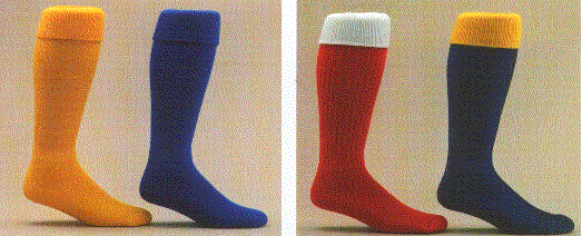 On the left is the solid color soccer tube sock that is available in all sizes and colors. On the right is a picture of the colored fold over top heel and toe. These are available in all color combinations.