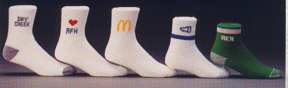 We have many types of custom embroidered socks and are presenting just a few of the choices below. Please note that 18 pair is the minimum without a custom imprint and that 36 pair is the minimum with a custom imprint. If you have an interest in imprintable socks you are invited to request our free 24 page catalog on sock please call us at 206 285-5359 or email: donace@promotionalproductsandideas.com
