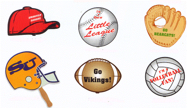 We have a complete selection of stock shaped Sports Fans that can be custom imprinted on the front with your school name, logo and colors or for your sports organization. The back of the fan has ample room for a schedule or information for your school or organization. Stock shaped fans are available for Tennis, Soccer, Basketball, Golf, Baseball, Football and Volleyball. Also we have stock Mascot shapes and can also do custom shapes of Mascots.