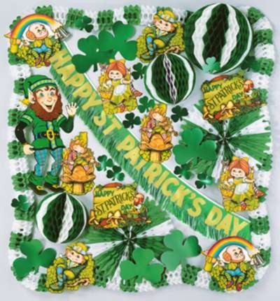 The #33605 St Patrick Decorating Kit is priced at $ 52 and consists of 1 - 19" Art Tissue Ball, 2 - 25" Art-Tissue Fans, 6 -12" Foil Shamrocks, 1 - 33" Jointed Leprechaun, 1 - 10 foot St. Patrick's Day Banner, 2 - 14" Art-Tissue Balls, 12 - 5" Foil Shamrocks, 8 - 16" St. Patrick Cutouts, 2 -1 17" St. Patrick Signs and 4 - 12foot Arcade Garlands
