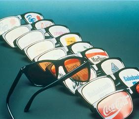 Presented below are pictures of custom imprinted lens with the imprint visible only to the person looking at the wearer of the sunglasses. When you wear the sunglasses you can see thru them without the imprinted lens being visible.These are a great way to attract attention for your business, product, team or organization.The lenses are made from shatterproof polycarbonate, and block 100% of UVA and UVB. Any design you may want to print can be put on the lenses and also the temple of the sunglasses can be imprinted. They are available in either traditional Black frames or color frames. Both Adult and Kids sunglasses are available. Minimum imprintable quantity is 150.
