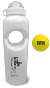 This 30 oz. - 10" X 3" Water bottle has a built in tennis ball stress reliever. It provides an imprint area of 1 3/4" X 2 3/4" on the water bottle. Less than $ 4 each in the minimum imprintable quantity of 50.