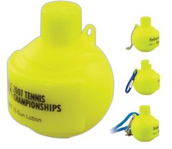 Ace your events with our tennis ball shaped 1 oz. sunscreen bottle. It comes with a tag that is attached with the product information. The imprint area is 1.45" X .65" and the product is less than $ 3.50 each in the minimum imprintable quantity of 150.