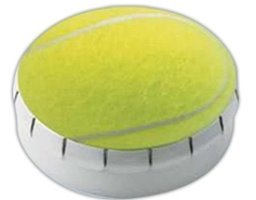 These delightful tennis shaped canisters contain 1/4 oz. of mints. Choose from Cinnamon, Wintergreen or Peppermint mints. The tin is recycleable and it measures 1 3/8" X 3/8" and provides an imprintable area on the tin of 1 1/8" in diameter. Less than $ 1.85 each in the minimum imprintable quantity of 250.