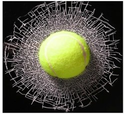 The tennis ball is in 3D and it looks just like a window that has been broken by an errant tennis ball. Actually it is a static cling of an actual 1/2 of a tennis ball. Great product for fundraisers and booster clubs. The break thru decals adhere to any smooth surface using its static cling - no adhesive or messy residue. Custom imprintable area is 1" X 1" and in the minimum of 250 they are less than $ 12.00 each.