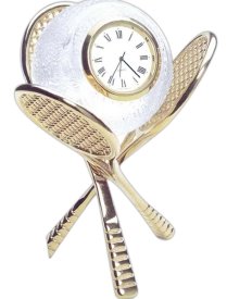 The 4" X 4" X 4 1/2" Tennis Ball award clock is made of 24% crystal with Roman numerals and second hand on a gold plated brass tennis racquet stand. Less than $ 28 each in the minimum oimprintable quantity of 50.