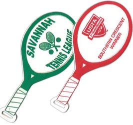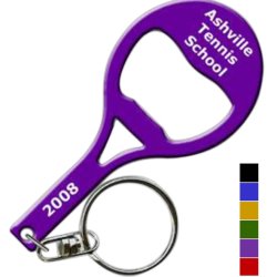 The 3 1/4" X 1 1/2" X 1/8" Tennis Racquet Bottle Opener is available in assorted colors of Black, Blue, Green, Gold, Purple and Red. It provides an imprint area of 3/4" X 3/16" or 5/8" X 5/*". In the minimum of 50 with a one color imprint the price is less than $ 1.50 each.