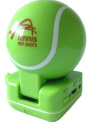 Made from plastic the tennis ball shaped USB speaker can be custom imprinted and is less than $ 12.50 each in the minimum imprintable quantity of 50.