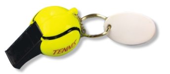 The 2 5/16" X 1 5/16" X 1 5/16" Tennis shaped whistle has an imprintable area of 9/16" X 1 1/16" oval disc that is attached to the whistle. Less than $ 1.35 each in the minimum imprintable quantity of 150. Great product giveaway for a tennis coaches clinic.