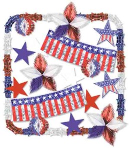 The #55707 Stars and Stripes Metallic Decorating Kit is $ 50 and consists of 3 - 12" Star Balls, 3 - 24" Leaf Starbursts, 2 - 14" Prismatic Patriotic Star Cutouts, 6 - 15" Foil Stars, 2 - 4 foot Metallic Stars and Stripes Banner and 4 - 9 foot Metallic Garlands
