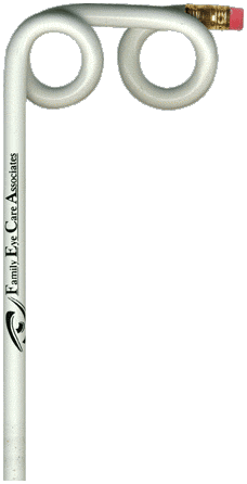 These are pens and pencils that are bent at the top to look just like glasses. They are great items for use at doctor's offices, trade show give aways and at medical conventions. Imprint area is 3" X .625". Available in a variety of colors and minimum imprintable quantity is only 250.