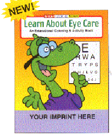 The Learn about Eye Care 16 page coloring book provides an imprint area of 7" X 1 3/4" and the minimum imprintable quantity is 250. Need a free sample just let us know.