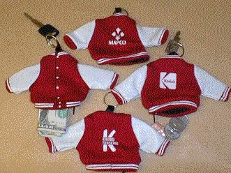 Our 4" Zipee is a combination zippered pouch, keychain and a zipper pull. It is available as either a Letterman Jacket, Leather Jacket or a Grey Sweatshirt. Each one of our Zipees is about 4" in size and provides an imprint area on the back of the item of 2" X 2". At the current time the Lettermen's Jacket is available in red only but early in the Year 2000 several other colors will be added. The minimum imprintable quantity is only 72.