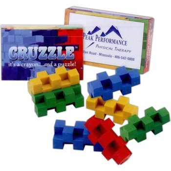 Cruzzles are a cool name for a combination crayon and puzzle. Each piece is 1 3/4" X 3/4" and each crayon box contains one each crayon of Red, Green, Blue and Yellow .The crayons are safe, non-toxic, and confirm to ASTM D-4236. Imprintable area on the back of the box is 2 3/4" X 1 1/4". Minimum order is only 250 boxes (4 crayons to a box).