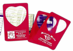 The Heart shaped magnifier measurs 2 1/8" X 3 3/8" and has a Fresnel lens with a 5x magnification. It is wafer thin, flexible and unbreakable. In the minimum order of 250 with your custom imprint they are $ .45 each.