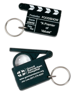 Measuring 1 5/8" X 1 3/8" the Clipboard magnifier and key chain provides an imprint area of 1 1/3" X 7/8" on the back or 7/8" X 1/2" on the front. In the minimum order of 300 they are less than $ 1.35 each.