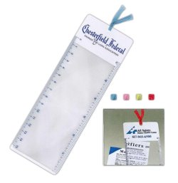 This 7 7/16" X 2 5/8" magnifier is also a handy bookmark, page holder and ruler.It provides an imprintable area of 2" X 2". In the minimum of 250 it is less than $ 1.60 each.