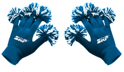 The Rally Gloves can be made in any color you want. Each Glove Finger has a mini Pom Pon attached to the tip of the glove finger. Plus your custom imprint can be embroidered on the gloves in an area of 1 1/2" X 1 1/2".