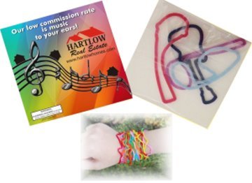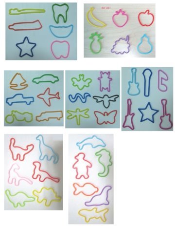 Squiggles are rubber bands that are bent into various themed shapes. Available themes are: Dinosaurs, Insects, Music, Sea Creatures, Fruit, Transportation and Dentistry. Each themed pack comes with an assortment of four squiggles shaped rubber bands in a see thru polypack with a full-color advertiser card. The imprint is on one side of the card with your four color custom imprint..