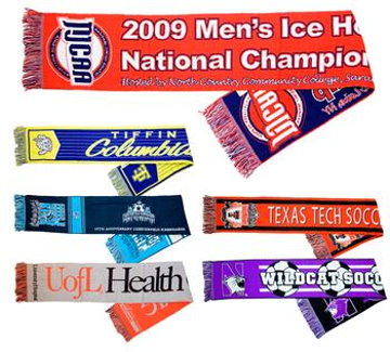 On the left is the 48" polyester Stadium Scarve that can be screen printed in the minimum of 300 and can be printed on both sides. On the right is the 24" woven Stadium Scarve made of 100% lightweight acrylic.