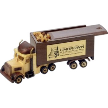 this unique wooden semi measures 14" x 4 1/4" x 5 1/2". Includes a sliding lid,