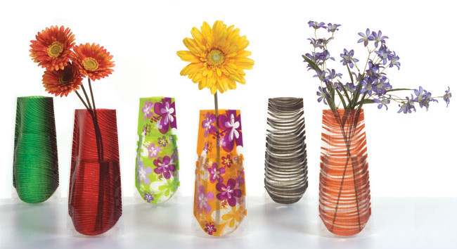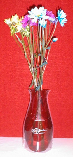 Our Wonder Vase measures up to 9 1/2" in height. Each vase starts out as flat as a piece of paper but when you add water it takes the shape of a vase and looks like an expensive piece of glassware.. Over 30 stock patterns available that can have your custom imprint or we can do a complete custom pattern and shape Wonder Vase for your needs. They will not leak, are super light weight and are colorful and attractive. Holiday, special ocassion and everyday patterns are available.Minimum order for the stock patterns with your custom imprint is 50.